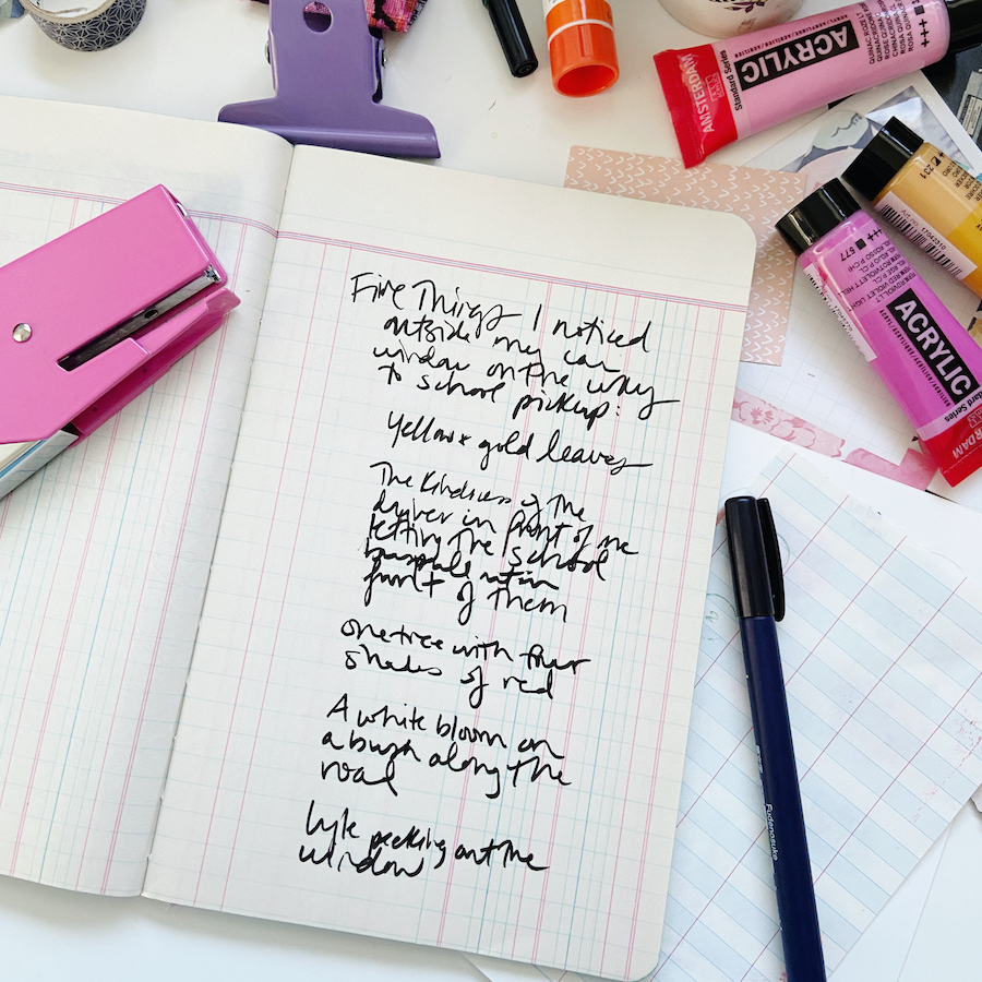 {Five Things} is already filling my days with noticing and intention. I love the combination of your thoughts and gentle guidance to actually put pen to paper, as well as some poetry inspiration and a few places to look at on the Internet. I have started a journal that is making me smile.