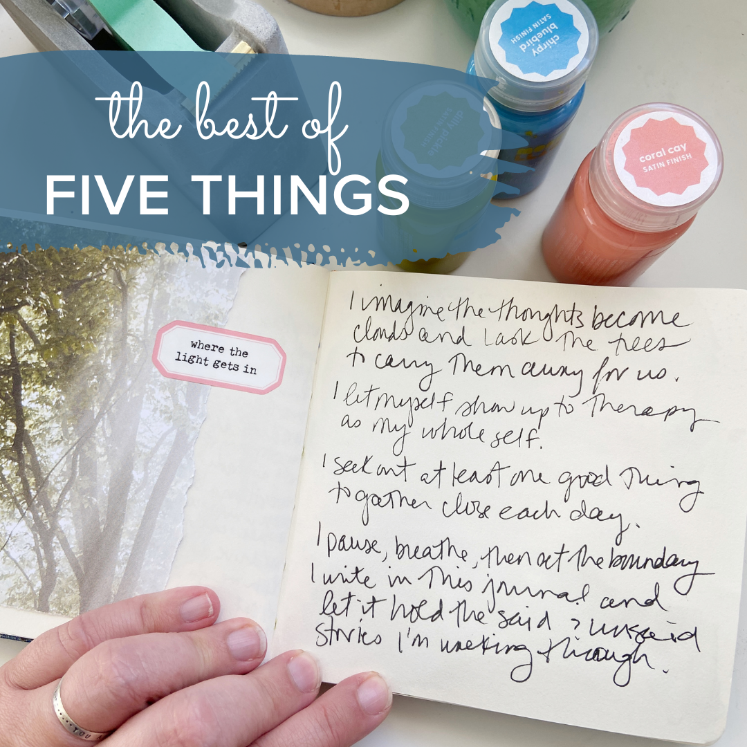 The Best of Five Things gives you a simple month-long practice of making a list of five things each day. With this special round of Five Things, I've gathered up 30 of my favorite prompts from previous rounds of Five Things (mostly from the sessions in 2022) and put them all in one place so you can take this course at any time, not just during the months I teach new rounds each year.